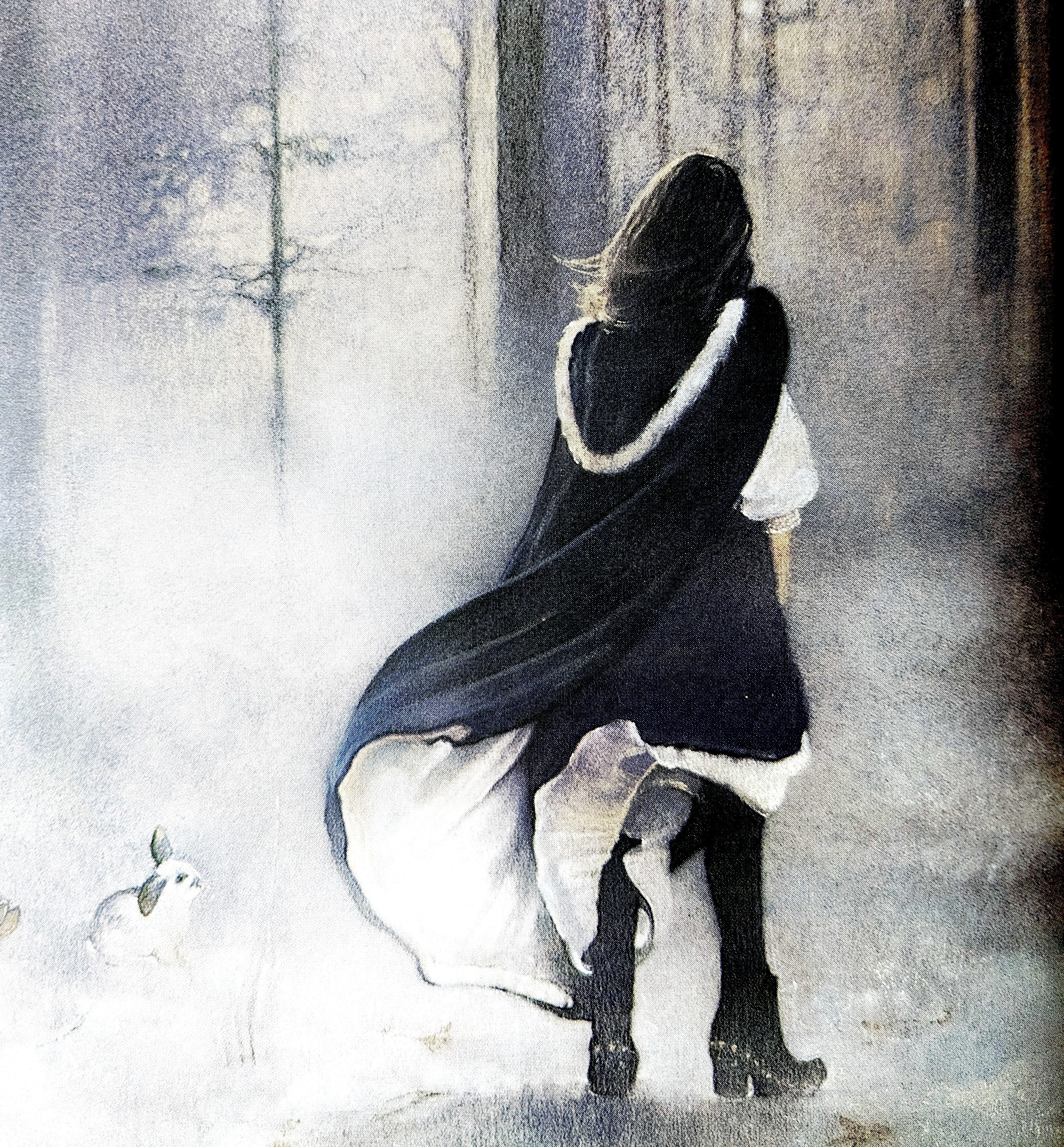 On and on she walked until her last pair of shoes fell in pieces. So she threw them away and went on with bare feet, not heeding the bogs or thorns that wounded her, or the stones that bruised her. At last she reached a beautiful green meadow on the edge of a wood, and walked in the soft cool grass.